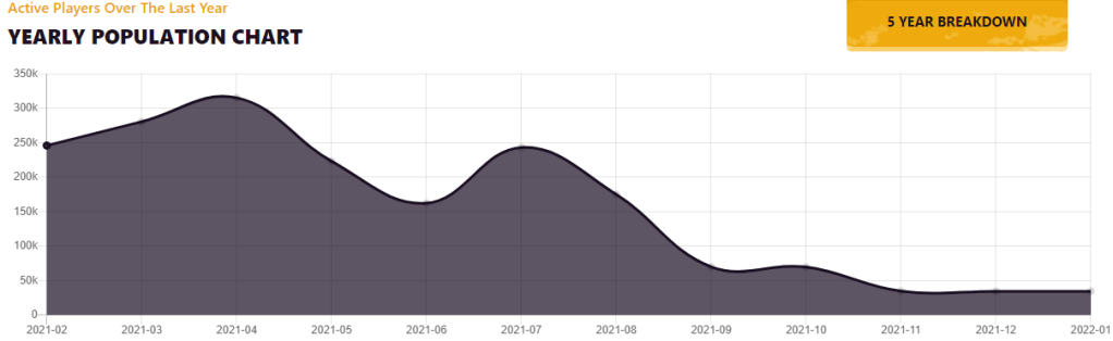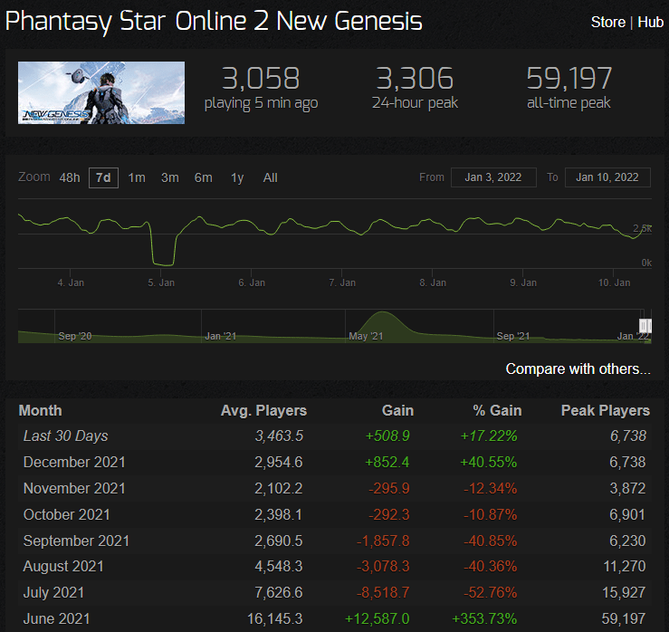 With NGS released in June of 2021 and an estimated peak of 250K users at the time, now looking at barely 50K in January of 2022 it just begs the question what happened? and where did the player base go? The figures are even worse according to Steamcharts. A rise pre NGS release is expected, same as with the drop of new NGS content in December. Nonetheless the picture is clear that the player base is declining despite Segas attempts at resuscitating PSO2.